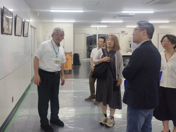 Prof. Hirohashi (left), Hiroshima Univ., guiding participants in the Radiation Disaster Medical Training Building.